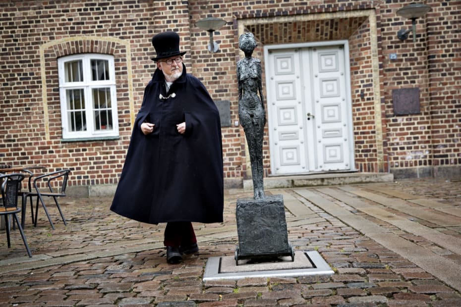 Jens Otto Nystrup, her iført sit oldermankostume, fra lauget ’Marens Venner’ er begejstret for Giacometti-skulpturen i Holstebro. Så begejstret, at han har skrevet en sang til hende.